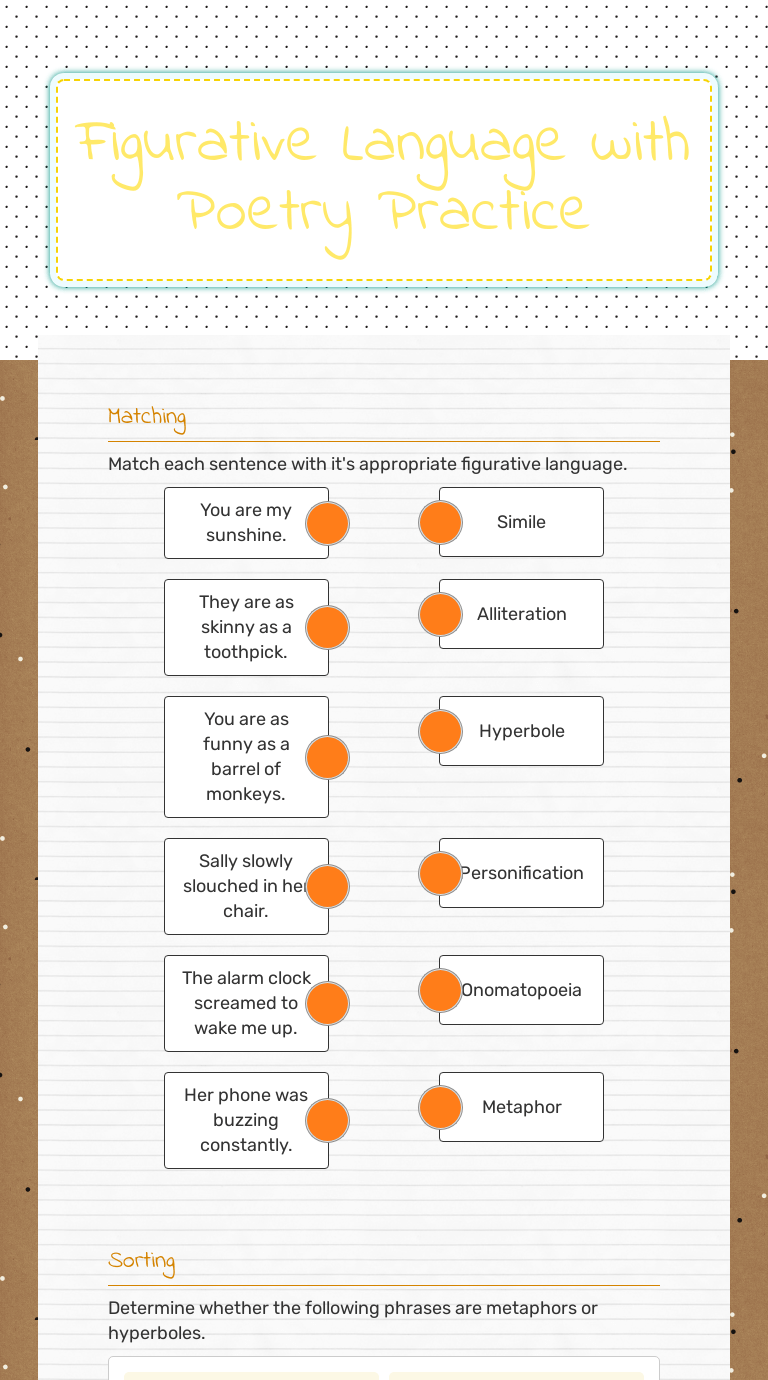 Figurative language practice | worksheet | education.com. Figure out which technique is being used: This worksheet is about types of common figurative language. Below you will find a collection of engaging worksheets that explore many different forms of figurative language. Read the lines of poetry. A collection of english esl worksheets for home learning, online practice, distance learning and english classes to teach about figurative, language, . Figurative languagethis is a 21 question worksheet/quiz in which students must identify each statement as the following: . Students should start with the figures of . Great for practice or review. This figurative language worksheet can be used as a fun sorting activity for your ks2 english lessons to help students understand the different types of . Match the phrase to the correct type by writing the letter in the blank. It includes their definition and some exercises to be done/ first part the . Students will learn to identify and interpret similes, metaphors, and personification in writing.